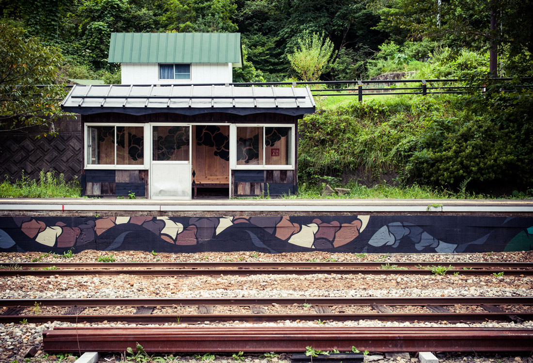 YUNOKAMI ONSEN ART PLATFORM PROJECT CLIENT: 湯野上温泉観光協会 / 会津鉄道(株) DESCRIPTION: WALL PAINT / Yunokami Onsen Station(湯野上温泉駅), AIZU /2014 LEARN MORE: http://www.yunokami.com PHOTO CREDIT: RiO Yamamoto http://www.rio-photo.com